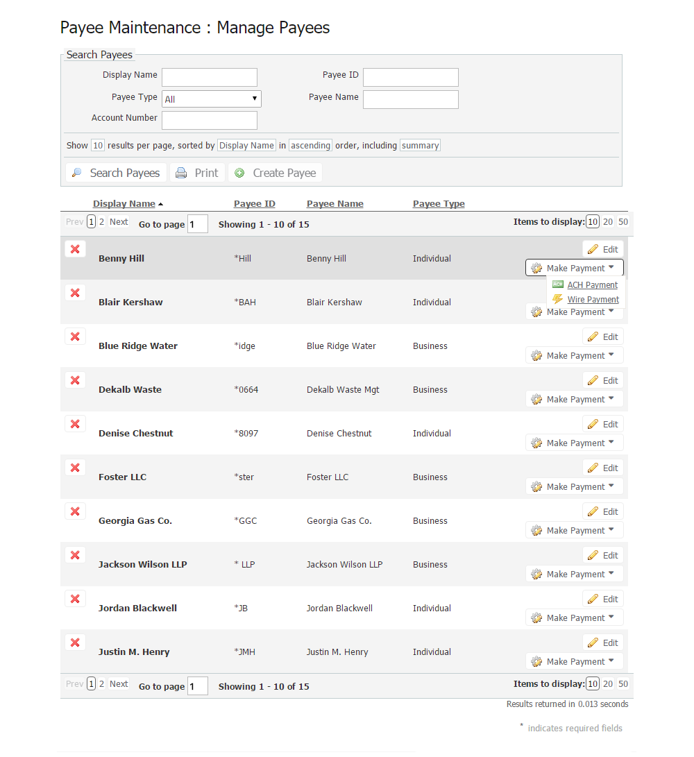- Click "Make Payment" on the payee line for Benny Hill to see links that would allow you to make an ACH or Wire Payment