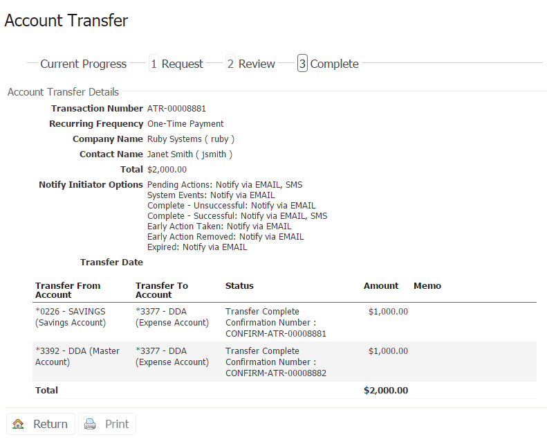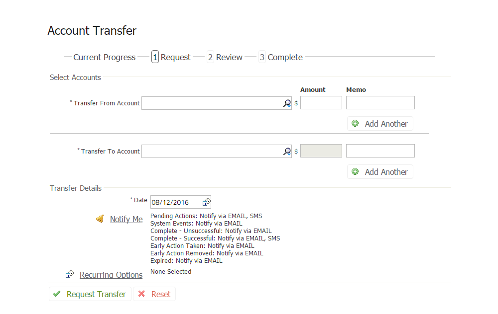 You can make transfers from one account to another, from one account to multiple accounts, or from multiple accounts to one account.