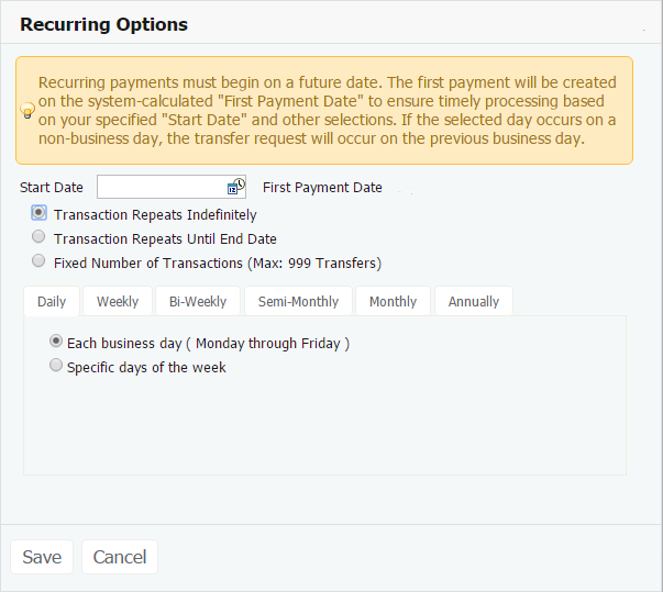 8. To set a transfer to happen on a recurring basis, you can define recurring options. Click "Recurring Options" to preview recurring transfer options