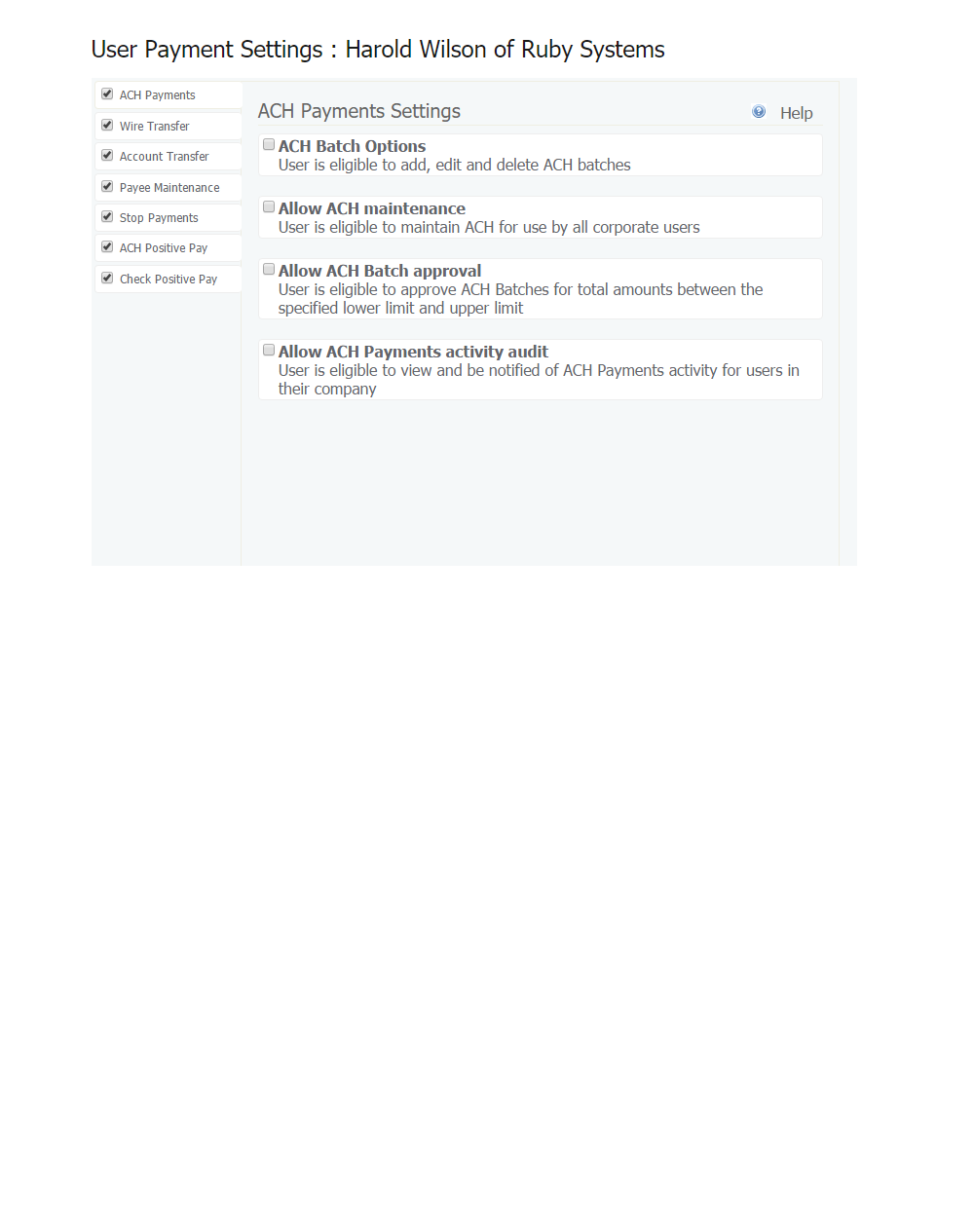 - Click the checkbox next to “ACH Batch Options” to see all of the controls for those payments by this user