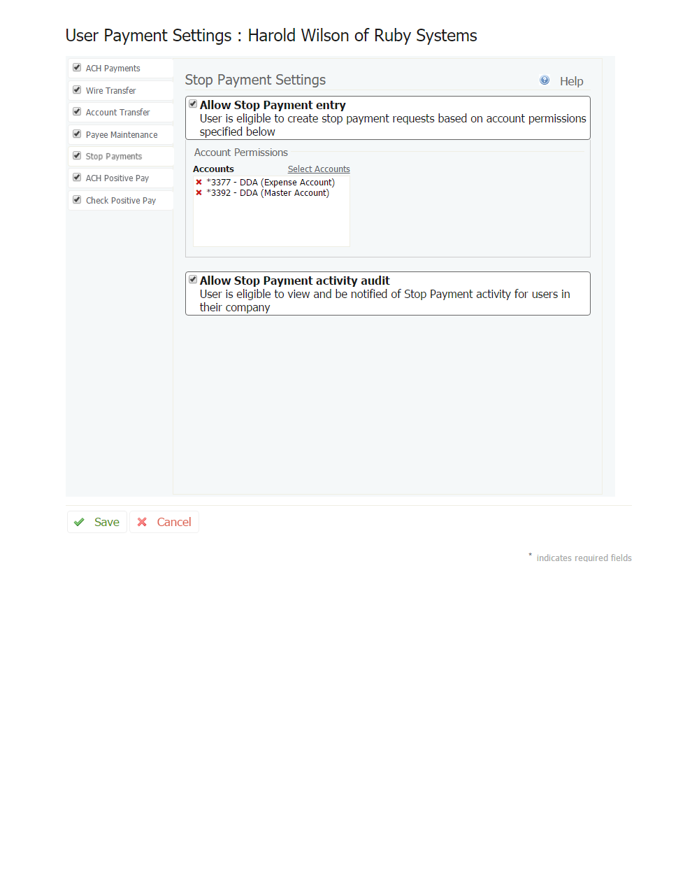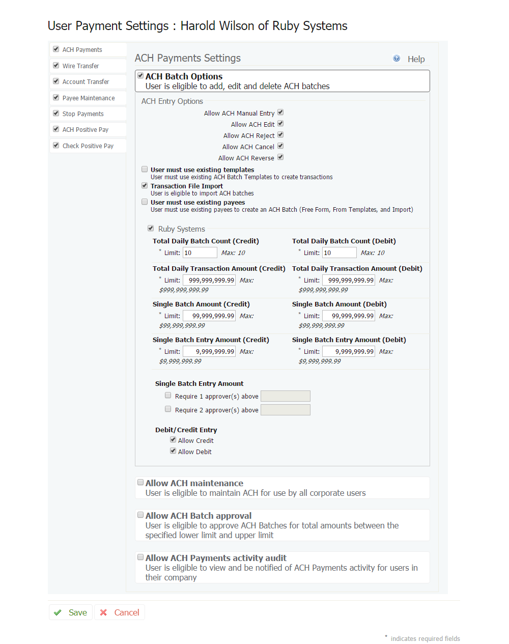 With User Payment Settings, you can permit different payment options to the user, restrict permissions, set transaction limits, and assign payment administrative permissions.