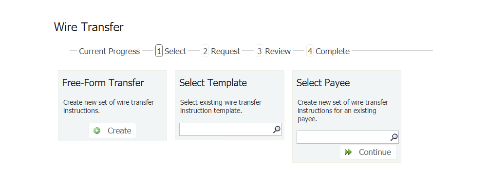 Notice you can create a wire transfer from scratch, from a template or by choosing a payee